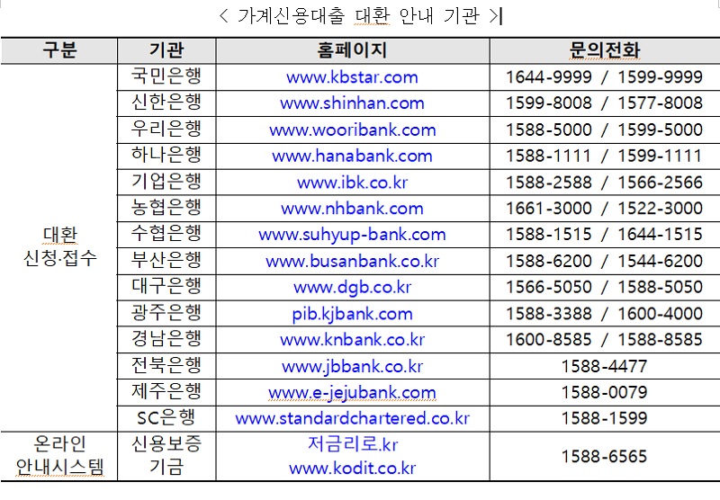 가계신용대출의 저금리 대환을 신청하려는 자영업자들은 기존 사업자 대출에 대한 대환과 마찬가지로 한글 도메인 “저금리로.kr”을 통해 신청대상대출과 자세한 신청절차 등을 확인할 수 있으며 신청 및 상담은 8.31일부터 전국 14개 은행*의 영업점을 방문하여 사업용도지출금액을 확인할 수 있는 서류제출해야 하며 대면으로만 신청이 가능합니다.