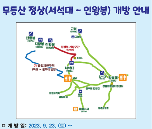 | 개 방 일 : 2023/09/23~ 개방구간 : 서석대 주상절리에서 군부대 를 지나 인왕봉 전망대까지 개방시간 : 10:00~3:30분 주의사항 : 군부대 방향 사진 찰영 금지 / 인왕봉 전방대 안전수용인원 제한으로 입장대기 시간 발생할 수 있음 날씨 확인후 입산 (무등산 산악기상정보서비스 (kma.go.kr) |